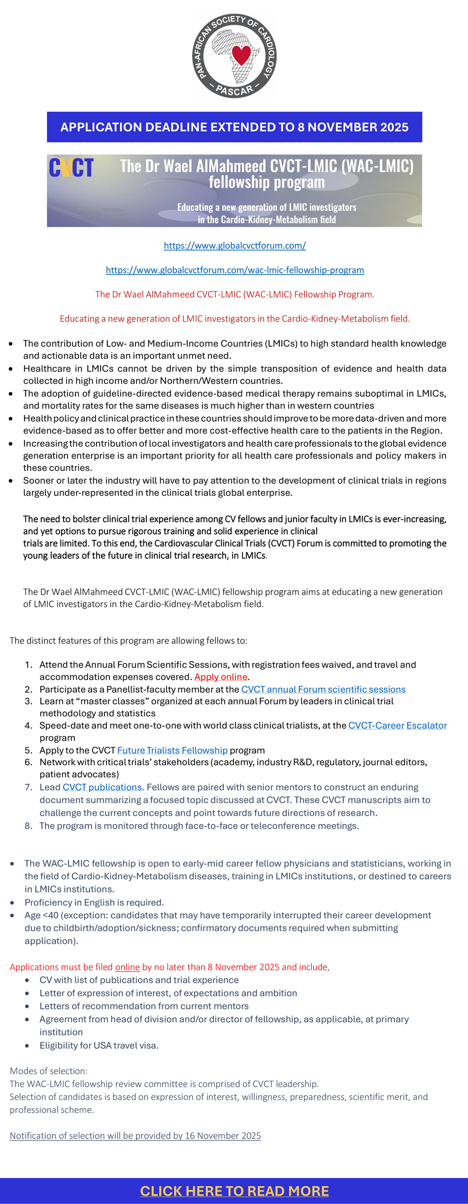 We are pleased to announce that this year marks the election of a new PASCAR leadership including the Governing Council and Task Forces Chairs during our upcoming Annual General Meeting. We strongly encourage your in-person attendance and active involvement in this important event that will take place during the Joint PASCAR and Nigerian Cardiac Society Congress 2025 in Abuja, Nigeria, on 18 September 2025. The Nominations for leadership positions has now been closed.
